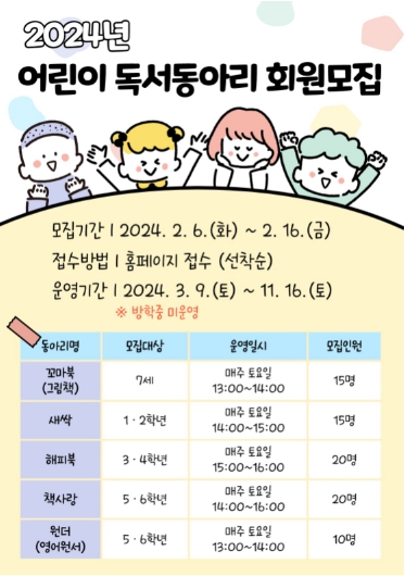 모집 동아리는 △꼬마북(7세, 그림책) △새싹(1·2학년) △해피북(3·4학년) △책사랑(5, 6학년) △원더(5~6학년, 영어원서) 5개 동아리이다.