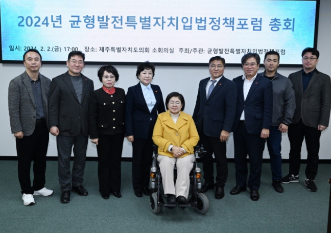 제주특별자치도의회 '균형발전 특별자치 입법정책포럼'(공동대표 정민구․현길호의원)은 2일 도의회 소회의실에서 ‘2024년 연구단체 총회’를 열어 2024년 연구활동 계획을 확정하고 본격적인 의정 연구활동에 돌입했다.