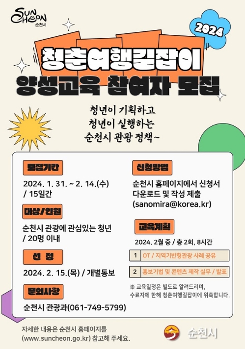 ![]() ‘3대가 즐기는 순천관광’을 이끌 청춘여행길잡이 교육생 모집 |