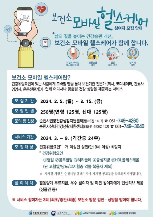 ![]() 순천시, ‘2024 보건소 모바일 헬스케어’ 사업 참여자 모집 |