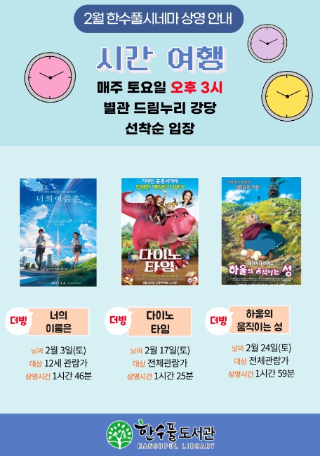 이 프로그램은 1월 ~ 12월 연중 진행하며, 매주 토요일 오후 3시 한수풀도서관 별관 2층 강당에서 매달 테마에 맞는 영화를 상영하며, 2월에는‘시간 여행’과 관련된 영화 3편을 상영할 예정이다.