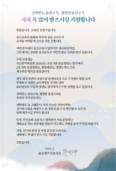 천창수 교육감은 “새해에도 작고 사소한 것에서부터 참여와 소통을 바탕으로 한 청렴 문화가 더 확산할 수 있도록 함께 해주시길 부탁드린다”며 “학생, 학부모와 소통하고 협력하며 서로 존중하는 평화로운 학교 공동체를 만들어 가는데도 지혜를 모아 주시길 바랍니다”고 말했다.