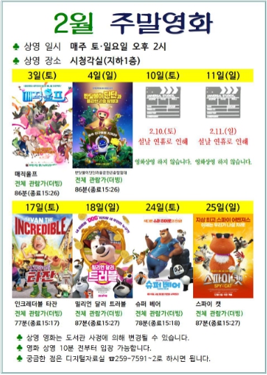 둘째 주 주말은 설날 연휴인 관계로 6~8일 오후 2시에 특선영화 3편을 상영한다. 상영작은 호기심 많은 강아지 머핀의 이야기를 담은‘나폴레옹’, 레미의 특별한 여행 이야기인‘레미: 집 없는 아이’, 초콜릿 공장의 후계자 토끼(이비)와 프레드의 슈퍼스타(밴드)의 여정을 그린‘바니버디’이다.