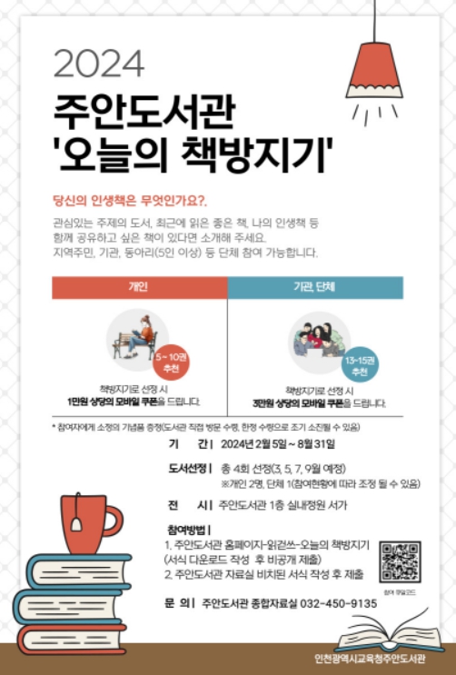 주안도서관 관계자는 “오늘의 책방지기 운영을 통해 명사가 추천하는 도서도 전시할 계획”이라며 “시민들에게 다양한 독서 정보를 제공해 도서관 이용에 도움이 될 수 있도록 하겠다”고 말했다.