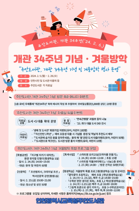 행사는 1990년 2월 6일 개관한 주안도서관을 기념하고 겨울방학 동안 지역주민에게 읽걷쓰 시민문화를 확산하기 위해 마련했다. 주 행사는 ▶‘개관 34주년 기념’ 방문 축하 메시지 이벤트 ▶‘개관 34주년 기념’ 자료실 특별 이벤트 ▶특별 인형극 공연 등이다.
