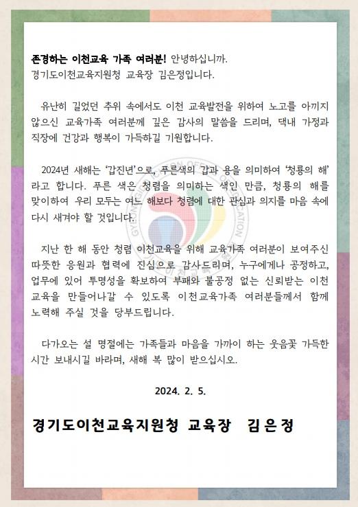 이천교육지원청 김은정 교육장은 “청룡의 해를 맞이하여, 더욱 청렴하고 공정한 이천교육을 위해 나부터 솔선수범할 것”이라며, “깨끗하고 투명한 공직문화를 조성하도록 노력하겠다”고 전했다.