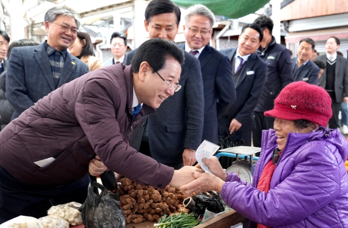 ![]() 김영록 전라남도지사가 설 명절을 앞둔 5일 영암군 영암5일시장을 방문, 상인들을 격려하고 성수품을 구입하고 있다. |