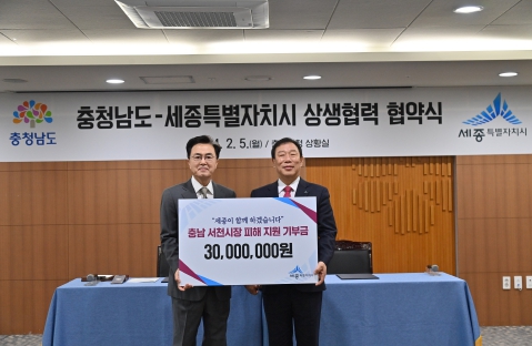 김태흠 지사와 최민호 시장은 5일 도청 상황실에서 서천특화시장 화재복구 성금전달식에 이어 ‘충남‧세종 상생 협력 업무협약’을 체결했다.