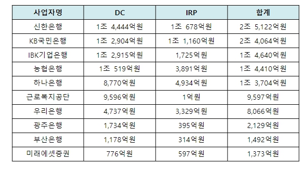 ![]() 퇴직연금사업자별 디폴트옵션 적립금 규모 상위 10개 기관 |