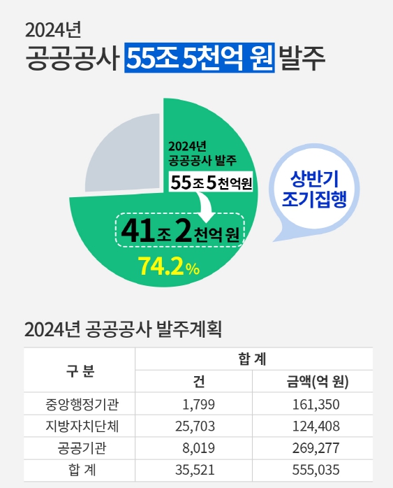 전체 55조 5,035억 원 가운데 74%가 넘는 41조 1,837억 원의 사업이 상반기에 조기 발주될 전망이다.