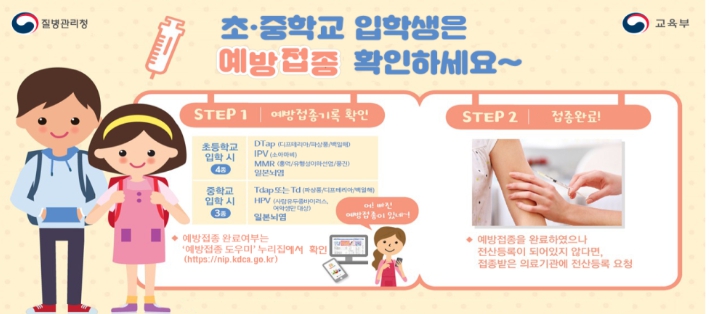 질병관리청, 교육부, 지방자치단체 및 초·중학교장은 관련 법에 따라 초·중학교 입학생의 필수예방접종 완료 여부를 확인하고 있다.