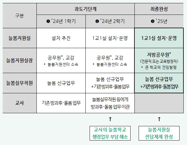 우선, 올해 1학기에는 과도기적으로 기간제교원 등을 학교에 배치하여 늘봄학교 신규 업무가 기존 교사 업무에 더해지는 것을 방지한다. 2학기에는 늘봄실무직원이 학교에 배치되어 기존에 교사가 맡았던 방과후·돌봄 업무를 포함한 모든 늘봄학교 관련 행정업무를 전담할 계획이며, 학교에 늘봄지원실 설치를 완료한다.