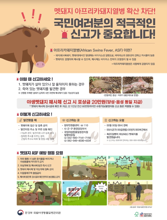 ![]() 야생멧돼지 아프리카돼지열병(ASF) 폐사체 신고 홍보 자료 |