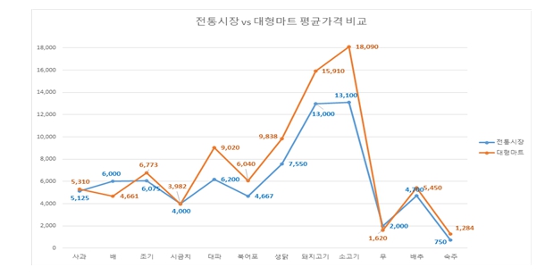 특히 대파, 북어포, 생닭, 돼지고기, 소고기, 숙주는 평균 20% 이상 전통시장이 쌌다.