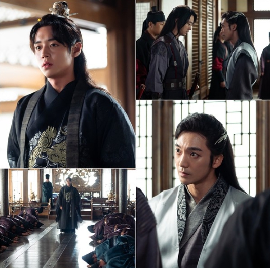 특히 편전 입구에서 왕의 호위무사 지전서(한은성 분)에게 가로막힌 사조 융의 모습이 눈길을 끈다. 그는 자신의 앞을 막아선 이들을 살기 어린 눈빛으로 바라보지만, 지전서 역시 흔들림 없이 왕의 명령을 수행하고 있어 긴장감을 더한다.