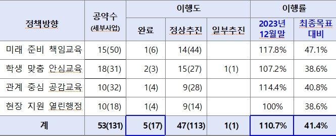 정책 방향별로 2023년 목표 기준 달성 정도는 미래 준비 책임교육 117.8%, 학생 맞춤 안심교육 107.2%, 관계 중심 공감교육 114.4%, 현장 지원 열린 행정 100%를 이행했다.