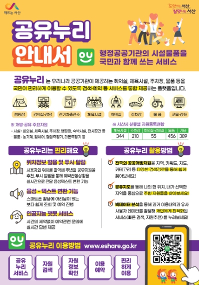 한편 서산시 공유누리에는 무료 주차장 정보 외에도 34개의 전기차 충전소, 체육시설 344개, 회의실과 강의실 55개를 비롯한 총 1454개의 공공개방자원이 등록돼 있다.