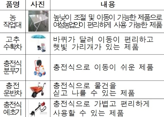 지원되는 장비는 △농작업대 △충전식 분무기 △충전식 운반차 △충전식 예초기 △고추 수확차 등이다. 아산에 거주하며, 농업경영체에 등록된 여성농업인 신청자 중 470명의 대상자를 선정하여 지원할 계획이다.