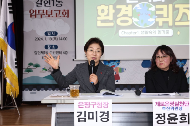![]() ‘갈현1동 동 업무보고회’ 중 환경 퀴즈의 정답을 설명하는 김미경 은평구청장(왼쪽). |