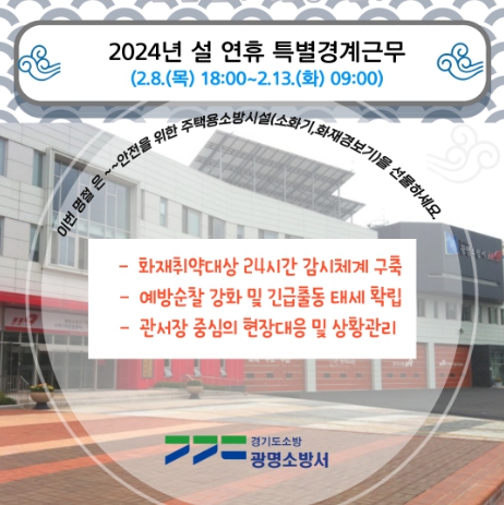 박평재 서장은 “연휴기간 동안 생활공간이나 숙박시설에 머무르는 경향이 늘어나면서 화재 위험성이 높아질 수 있다”며 “시민이 안전하고 편안한 명절을 보낼 수 있도록 비상체계를 유지하면서 대응에 만전을 기하겠다”고 전했다.