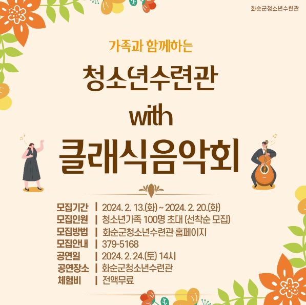 화순군 관계자는 “평소 접하기 힘든 클래식음악회를 통해 가족과 함께 소통하며 즐기는 시간이 되길 바라며 앞으로도 청소년들의 문화감수성 함양 및 진로 탐색에 도움이 되는 다양한 프로그램을 만들어 지원하겠다”라고 말했다.