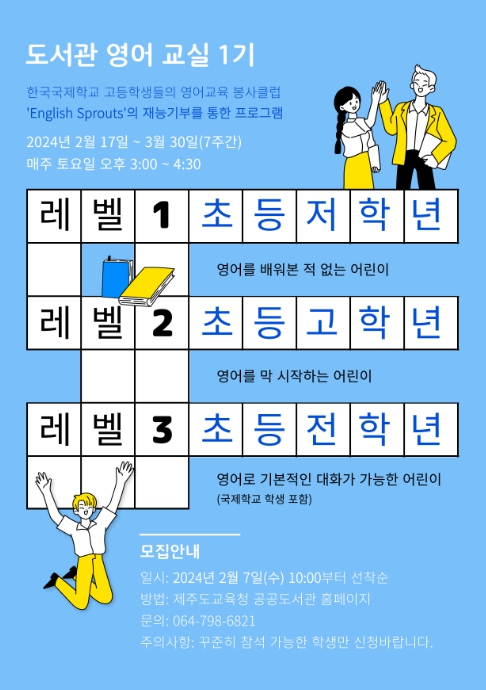 본 프로그램은‘KIS jeju’와‘BHA’국제학교 고등학생들로 이루어진 영어 교육 봉사클럽 English Sprouts의 재능기부 강의로 진행된다.