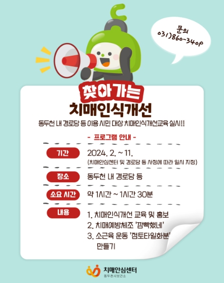 기타 찾아가는 치매인식개선 신청 및 자세한 사항은 동두천시 치매안심센터로 문의하면 된다.