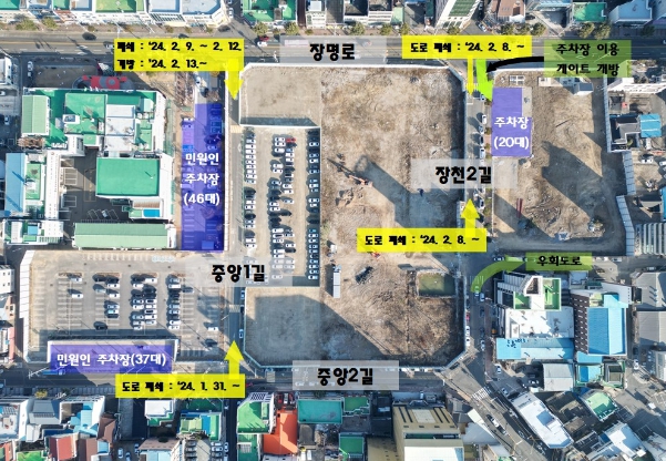 해당 공사 현장에 가설울타리(방음벽)를 설치하고 본 공사 토목 관련 터파기 공사를 진행하기 위한 것으로, ‘장천2길’과 ‘중앙1길’을 당분간 폐쇄할 계획이다.