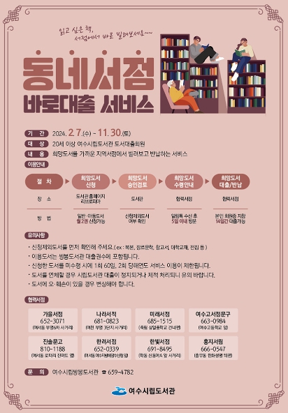 이용 방법은 여수시립도서관 홈페이지(yslib.yeosu.go.kr) 또는 모바일 앱 ‘리브로피아’에서 희망도서 신청 후 알림톡으로 수령 안내를 받으며, 도서대출회원증을 지참하고 해당 서점에서 직접 대출·반납하면 된다.