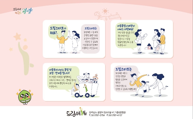 광양시 드림스타트 아동으로 선정되면 아동의 위기도에 따라 연 2회 이상의 가정 방문하는 기본서비스, 아동의 전인적 발달을 위한 필수서비스 11종(건강검진, 소방 및 안전교육, 아동권리 교육 등)를 제공받게 된다.
