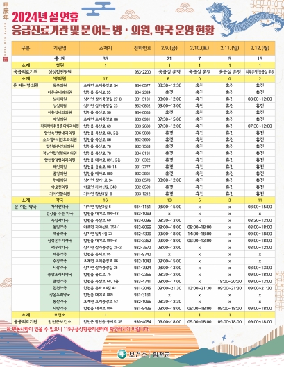 응급진료기관 및 문 여는 병의원‧약국 명단은 군청 및 합천군보건소 홈페이지를 통해 확인할 수 있다. 또한 관내 의료기관, 약국, 읍․면사무소 등 129개소 출입문에 안내문을 미리 부착해 안내하고 있다.