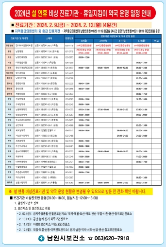 설 연휴 기간 동안 지역응급의료센터인 남원의료원은 평소와 동일하게 24시간 응급실을 운영하면서 응급진료체계를 유지하고 보건기관, 병·의원, 약국 57개소를 비상진료기관 및 휴일지킴이약국으로 지정하여 운영한다.
