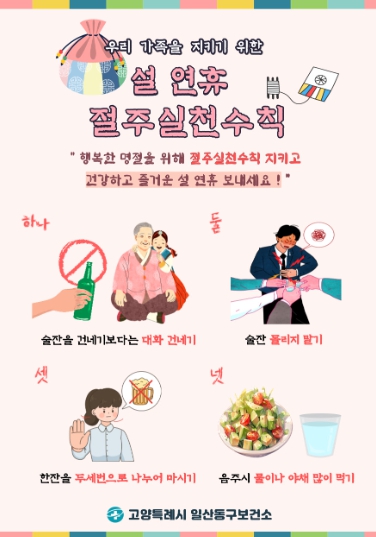 일산동구보건소 관계자는“지역사회 절주 문화 확산을 위한 다양한 사업을 진행 할 예정으로 추후 운영 시 많은 관심을 부탁드리며, 행복한 명절을 위해 절주 실천수칙을 지키고 건강하고 즐거운 설 연휴 보내시기 바란다”고 밝혔다.