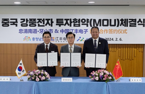 박경귀 시장은 6일 충남도청 상황실에서 김태흠 도지사, 중국 강풍전자 양쉐쩌(王学泽) 총경리와 투자양해각서(MOU)를 체결했다.