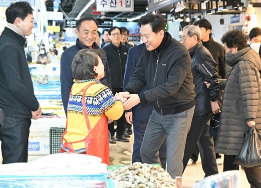 ![]() 6일(화) 오후 송파구 가락시장을 찾은 오세훈 서울시장이 설 연휴를 앞둔 명절 민생 물가를 점검하고, 상인들을 격려하고 있다. |