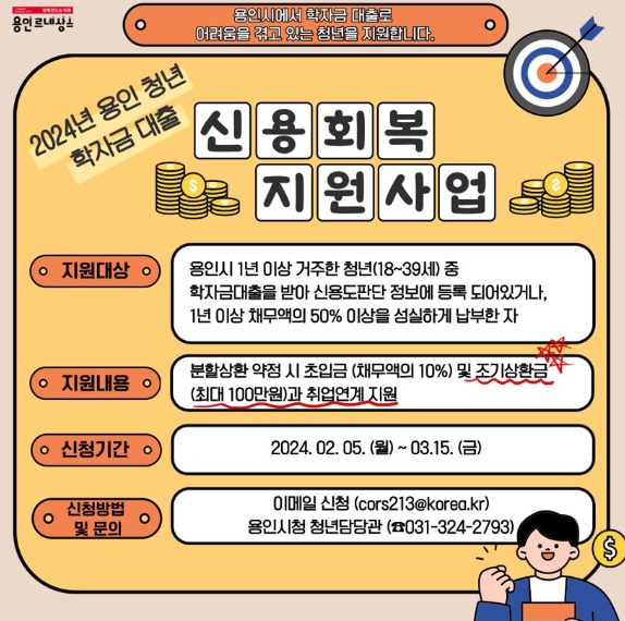![]() 용인특례시가 학자금 대출 청년을 대상으로 신용회복지원사업을 한다 |