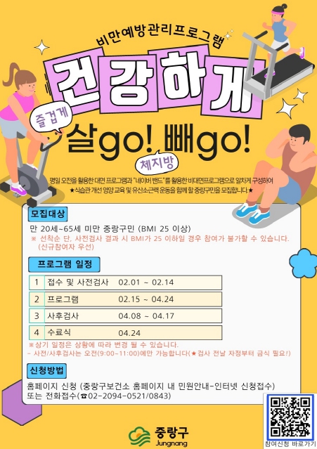 참가를 원하는 주민은 중랑구보건소 누리집(홈페이지)에서 온라인 신청하거나 구 건강증진과로 신청하면 된다. 단, 사전검사 결과 BMI 25 미만일 경우 대상에서 제외될 수 있다.