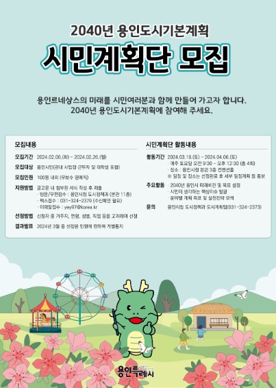 시 관계자는 “2040 도시기본계획 수립에 시민들의 의견을 반영하기 위해 시민계획단을모집한다”며 “시의 미래에 관심이 있는 많은 시민의 참여를 부탁드린다”고 말했다.