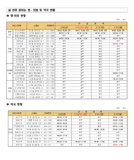 연휴기간 중 지정 병·의원 및 약국 진료 일정 등은 괴산군보건소 홈페이지 및 응급의료포털 E-Gen, 응급의료 정보제공 어플 등을 통해 가장 가까이 위치한 문 여는 의료기관 및 약국을 확인할 수 있다.