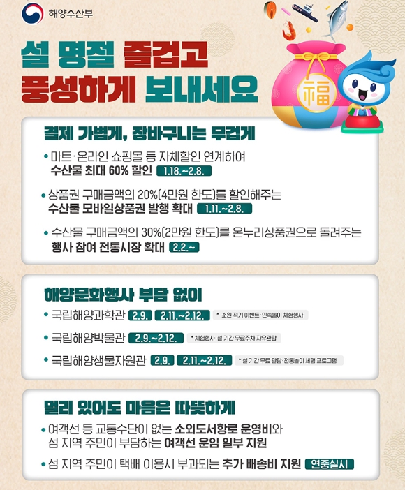 · 상품권 구매금액의 20%(4만 원 한도)를 할인해 주는 수산물 모바일상품권 발행 확대 (1.11.~2.8.)
