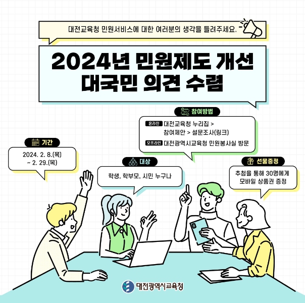 대전광역시교육청 송기선 총무과장은 “이번 대국민 의견수렴을 통해 다양한 의견을 충분히 경청하고 수요자의 요구를 심도 있게 파악하여, 불편 사항을 최소화한 맞춤형 민원 서비스 제공을 위해 최선의 노력을 다하겠다.”라고 밝혔다.