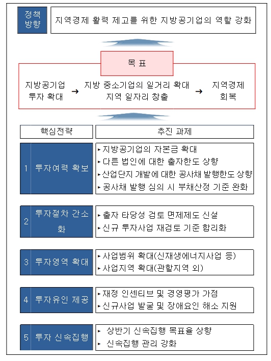 특히, 지방공기업이 시행하는 공사의 대부분을 지방 중소건설사가 담당하는 것을 고려하여, 어려운 지방 중소건설사에 일거리를 제공할 수 있도록 10억 이상 투자사업을 확대하는데 중점을 두었다.