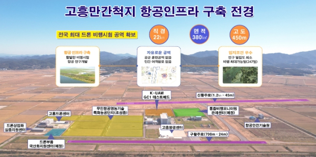 그중 고흥은 전국 최대 규모의 비행시험 공역(직경 22㎞), 고흥 항공센터, 국가종합비행시험성능장(1.2㎞ / 700m 활주로), 고흥 드론센터, 드론상업화 실증 지원센터, 드론 특별자유화 구역 지정 등으로 드론·UAM 중심도시 고흥의 입지를 확고히 하고 있다.