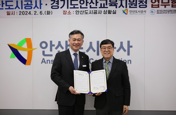 ![]() 허숭 안산도시공사 사장(왼쪽)과 김태훈 안산교육지원청 교육장이 업무협약을 체결하고 기념 촬영을 하고 있다. |