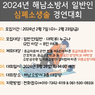 ![]() 2024년 제13회 해남소방서 일반인 심폐소생술 경연대회 참가자 모집 |