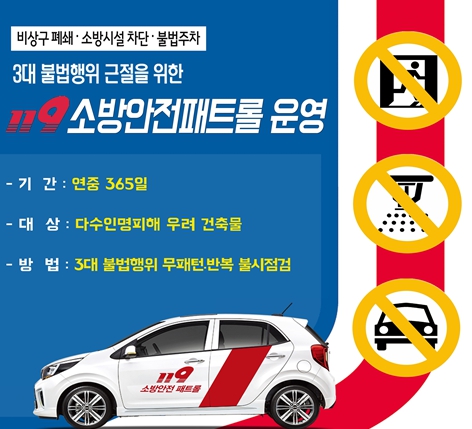 이에 올해도 3대 불법행위 집중 단속 계획을 발표하여 ▲연중 소방안전 3대 불법행위 불시 단속 ▲비상구 신고포상제 운영 ▲화재 대피·피난 교육훈련 등을 지속적으로 실시하기로 했다.