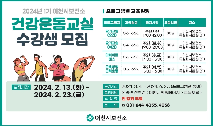 1기 운동교실 참여를 원하는 시민은 2월 13일부터 23일까지 이천시홈페이지 교육포털 시스템에서 신청하면 된다.