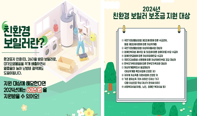 이 사업은 국민기초생활수급자, 차상위계층, 장애인, 한부모가족 등 지원 대상자가 가정용 노후 보일러를 친환경 보일러로 교체 또는 신규 설치하면 1대당 60만원을 지원한다.