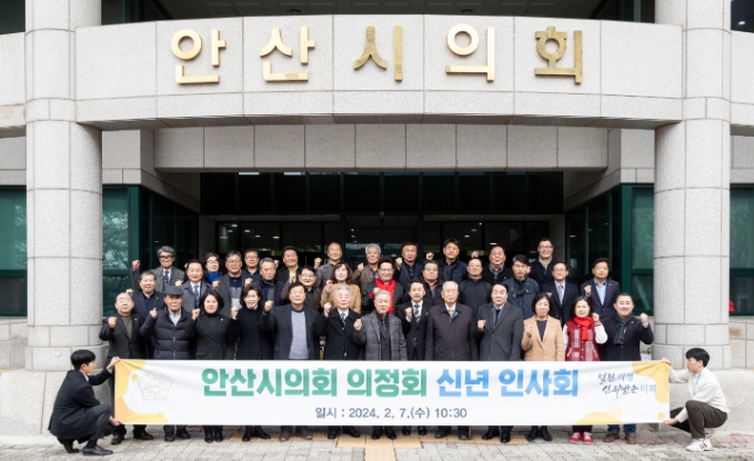 ![]() 안산시의회가 지난 7일 의회 대회의실에서 ‘2024 안산시의정회 신년인사회’를 개최했다. 사진은 이날 참석자들이 의회 앞에서 기념촬영에 임하고 있는 모습. |