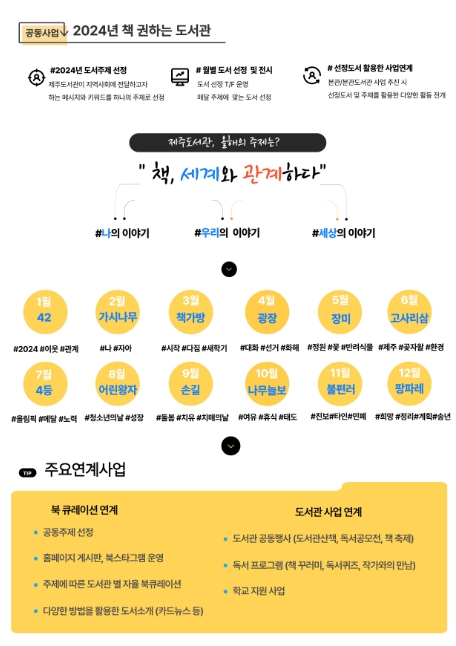 2024년 올해의 주제는“책, 세계와 관계하다”로 책을 통해 나, 우리 그리고 공동체라는 세계를 연결하는 12개의 월별 소주제를 선정하여 북 큐레이션 사업, 도서관 공동행사 및 독서문화프로그램, 학교지원 연계사업 등 공동의 목표 및 정책지향과 함께 도서관 별 연계사업을 운영한다.